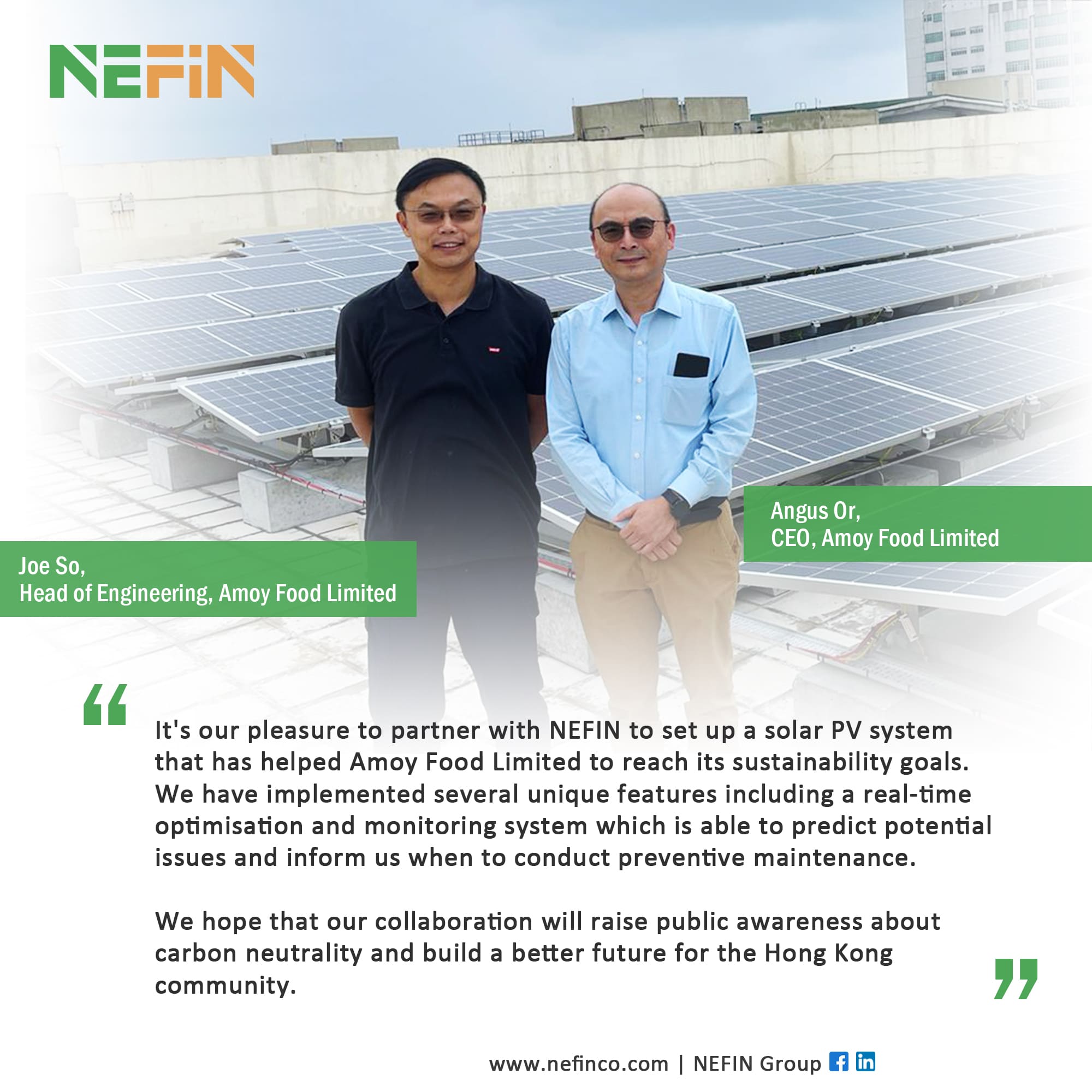 “It’s our pleasure to partner with NEFIN to set up a solar PV system that has helped Amoy Food Limited to reach its sustainability goals. We have implemented several unique features including a real-time optimisation and monitoring system which is able to predict potential issues and inform us when to conduct preventive maintenance.